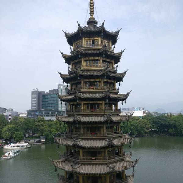 晚上比白天漂亮,门票42不值日月双塔是坐落于桂林市中心杉湖中的两座宝塔,日塔为铜塔,月塔为琉璃塔,两塔之间以湖底一条10多米长的湖底隧道相连。晚上比白天漂亮,门票42不值。