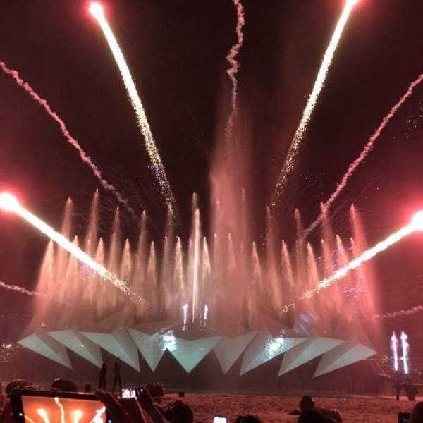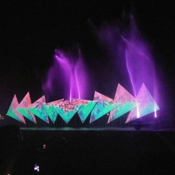 跟演唱会一样,门票分观赏区。普通席的,来得晚的话...一场灯与影,水与雾,烟火与音效的盛宴。7点多在海上盛开,大概大半个小时左右。8点多也有一场,很别出心裁。但全程英语演绎且没有字幕,看起来有一点点费劲。
