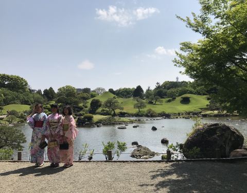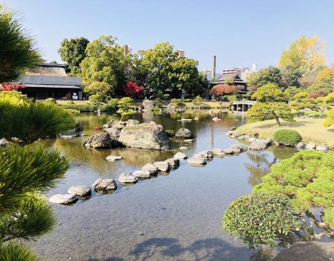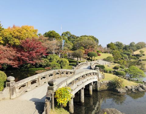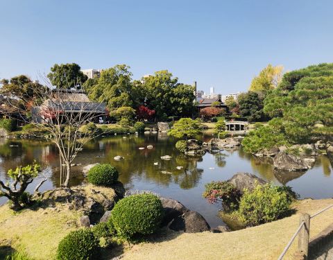 水前寺成趣园建于十七世纪时,占地七万平方公尺,为当时称“熊本”为“肥后”时的领主细川忠利所创建,原本只是设立为私人用之庭园“国府御茶屋”,之后经过细川纲利的细心维护和规划扩建,才有今日的规模。水前寺成趣园由来于陶渊明的诗词“归去来辞”,而取名成趣园。 游走于水前寺成趣园内可望见绿意盎然的树木花卉,感受自在悠间的轻松心情,美轮美奂的人工山水将水前寺衬托得非常整齐美丽,庭园内的水池中涌出的是来自于阿苏山脉的伏流水。另外还有古色古香的古今传授间、小桥、池塘、高大的鸟居门等,让水前寺成为景色优美富趣味性花园,宛如汇聚了趣味性而成的庭园;于出水神社内还有甘甜清澈的泉水称为“长寿之水”,也是水前寺内的一景,由于环境优雅景色宜人,吸引许多人前来观赏,因此水前寺成趣园为日本有名的美丽景点之一。