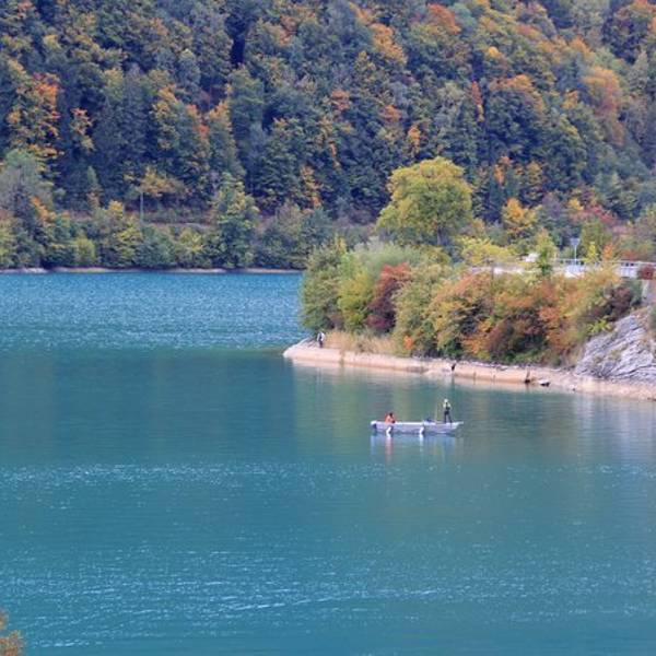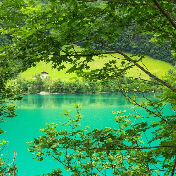 抵达的时候正是有淅淅沥沥的小雨,天气并不晴朗,缺恰到好处的把湖水的颜色映衬的如同不规则的蓝宝石一般,不饰雕琢,浑然天成。山间的绿色和红色的房顶与这枚“蓝宝石”相得益彰,呼应的分外高级。一通拍照之后,已经晚上8点半了,阳光也躲到了山后面