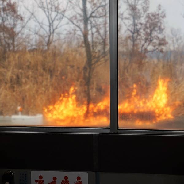 不过在附近的草地上,有直升机观光的服务从观光巴士上下来,就是看上去废弃的一座建筑车子在草千里的时候会停下,远处的阿苏火山还在喷着烟