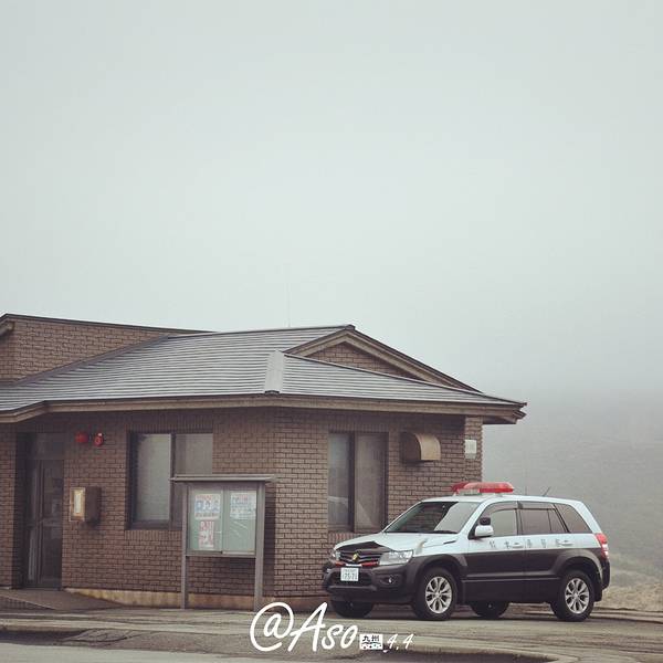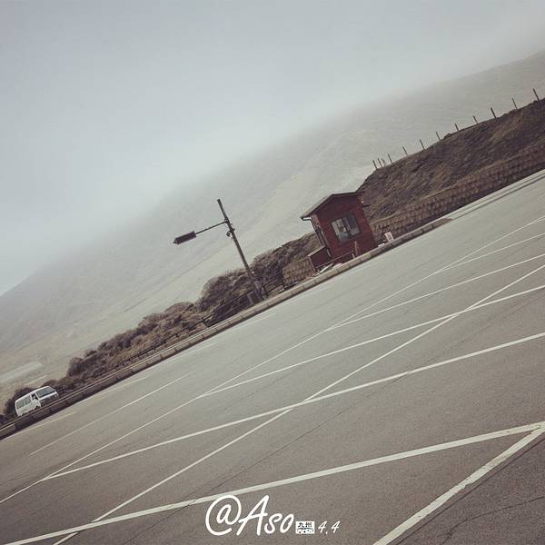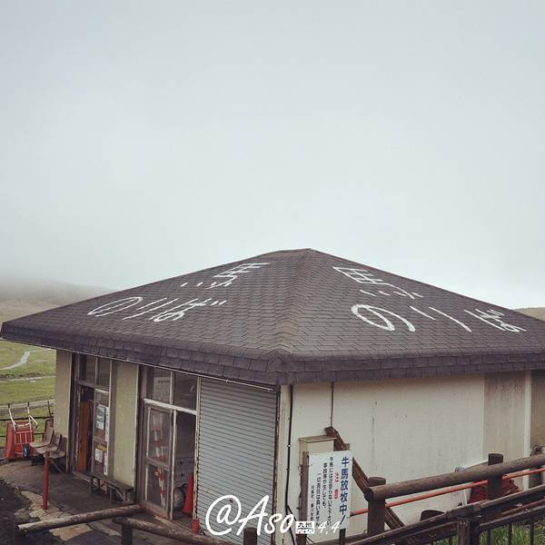 从观光巴士上下来,就是看上去废弃的...车子在草千里的时候会停下,远处的阿苏火山还在喷着烟