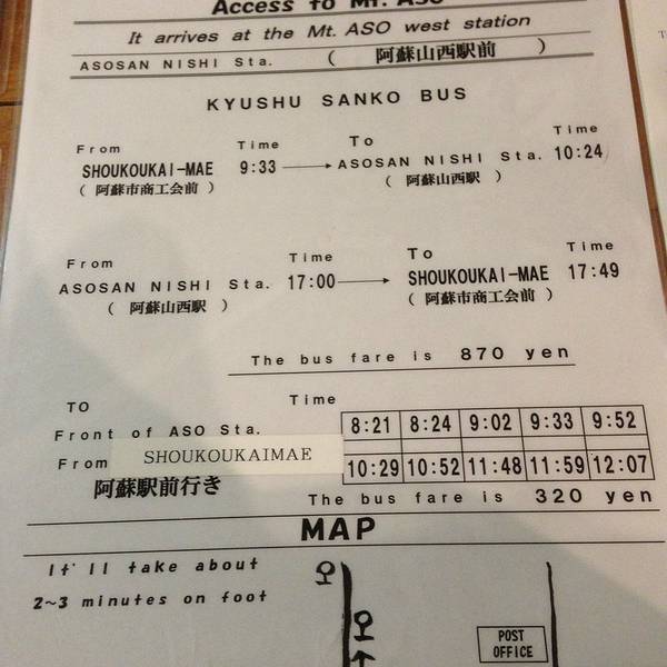 到达JR阿苏以后,出来右手边有大巴,大多数人都是去阿苏山的,基本不会做错,当然上车问一下还是要,不用提前买票,上车拿小票,下车把钱和小票给司机大叔,就OK,大概30分钟左右吧~