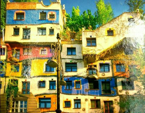 百水公寓,这个公寓说实话就像一幅儿童随意涂抹的水彩画,外墙面上,红、蓝、黄、紫、桔红,大块大块...百水公寓,这个公寓说实话就像一幅儿童随意涂抹的水彩画,外墙面上,红、蓝、黄、紫、桔红,大块大块鲜艳的颜色拼在一起,让人目不暇接的五彩斑斓!