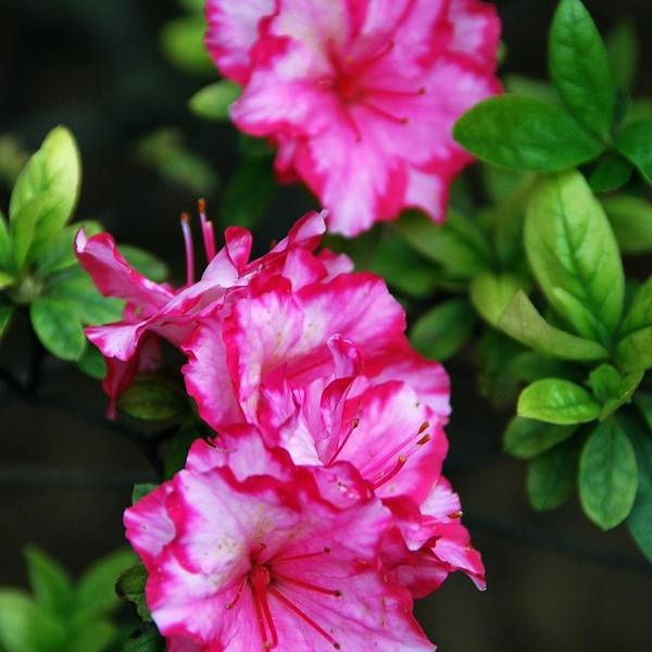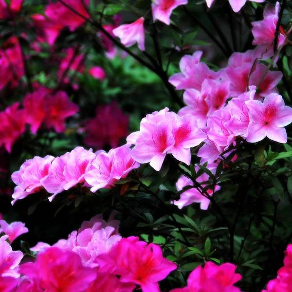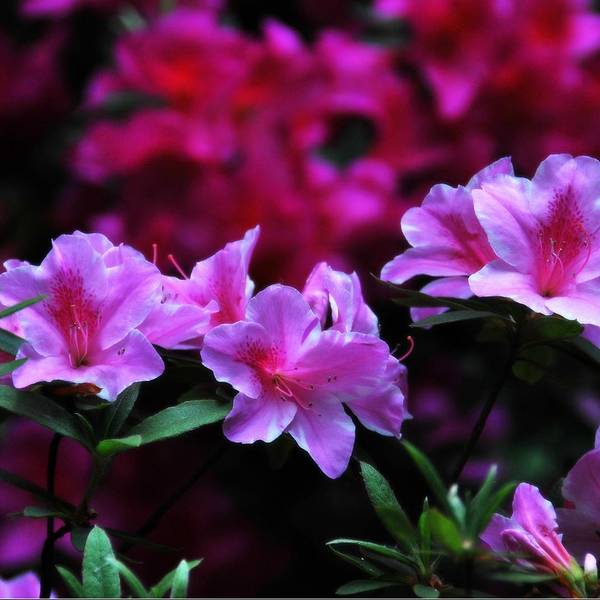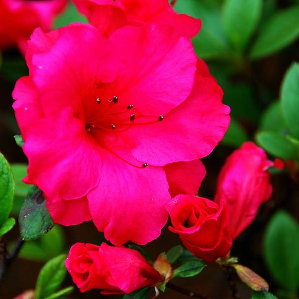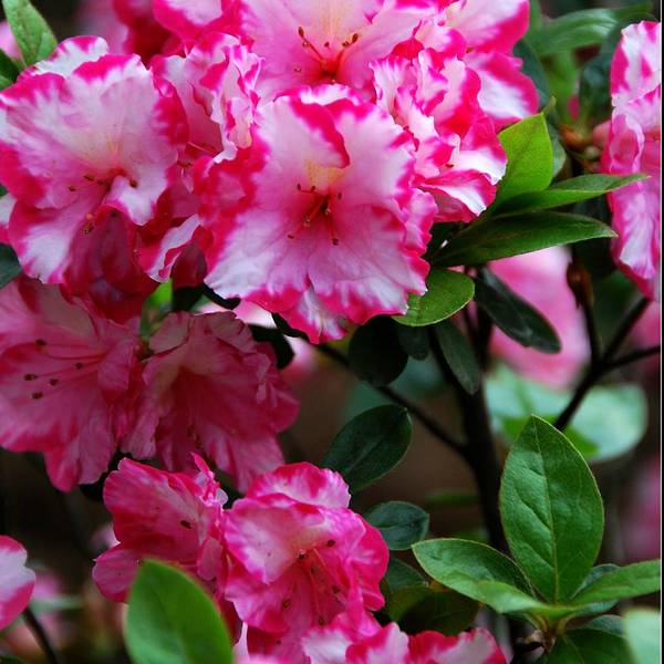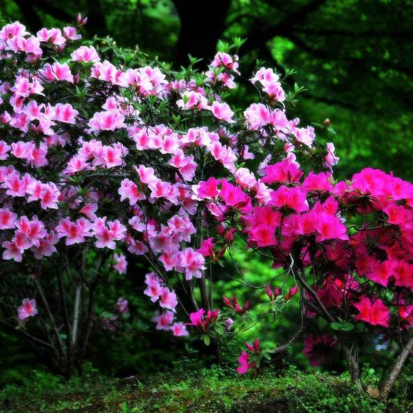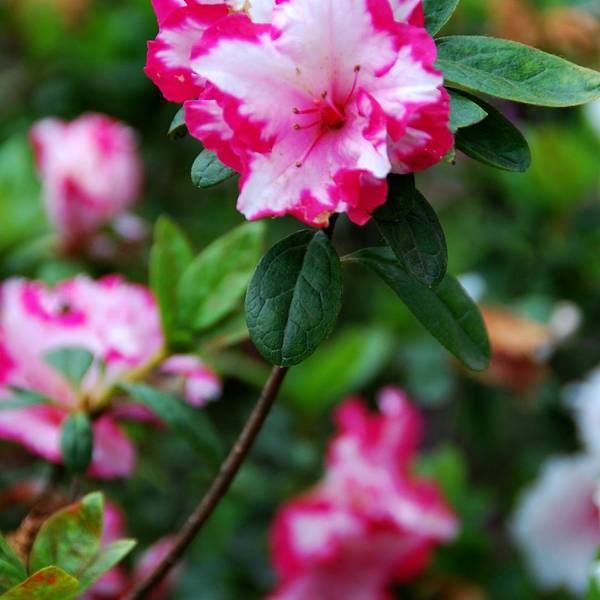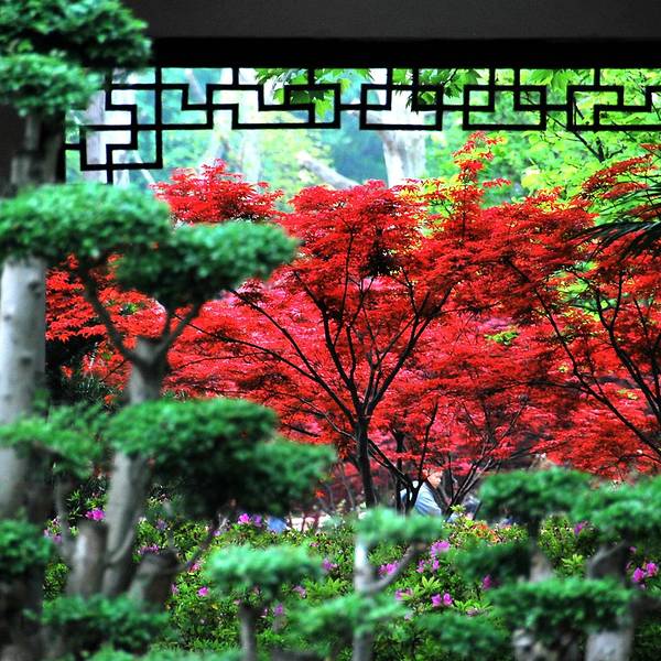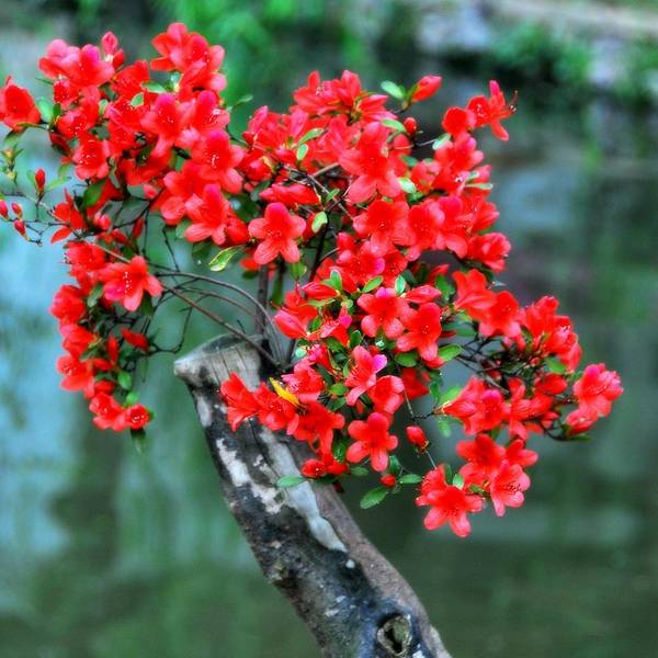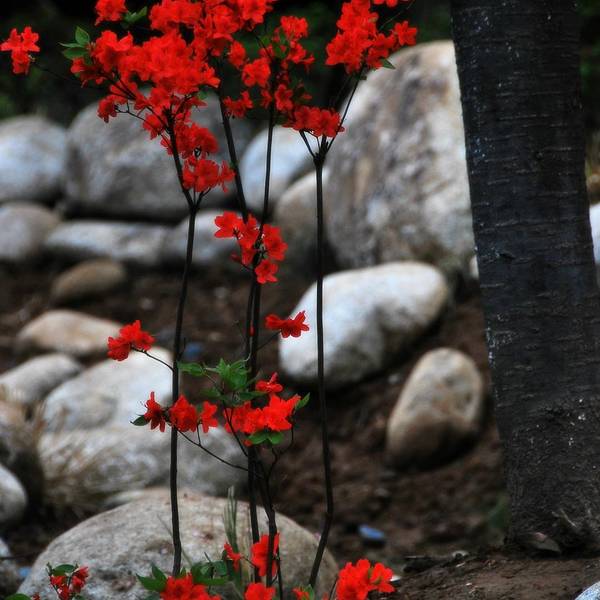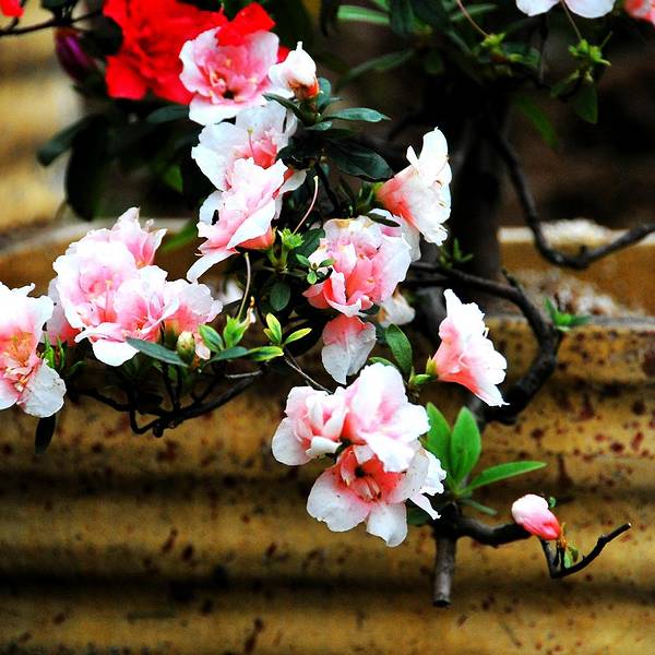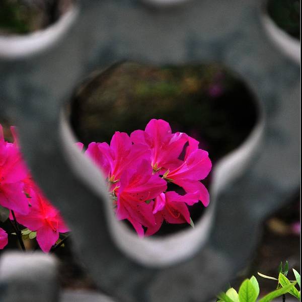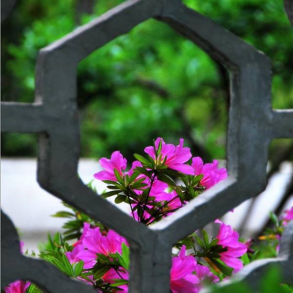 青山公园在每年春天都会举办杜鹃花展,久而久之,也就形成了一定的规模,展出的杜鹃花品种和数量都是其它地方无法企及的,每年春天慕名而来赏花的人也是络绎不绝。公园内绿化非常好,随处可见参天的古木。绿树、红枫,还有五颜六色的杜鹃花,这场景仿佛就像一幅浓墨重彩的工笔画。当杜鹃遇上红枫,便是真正的姹紫嫣红这一种杜鹃花是园艺最常见的品种,在很多的住宅区都有种植。公园是一座典型的中式园林,从窗棂里望出去,无论看到的是沁人心脾的绿色,还是静静绽放地花朵,都有种莫名的新发现般的惊喜,这也许就是窗棂透景的妙处所在了。最常见的品种映山红,看得出来为了让这常见的品种变得不“常见”,园艺师们在造型上是下足了功夫丰丽和凤冠,丰丽的颜色接近玫瑰红,花芯黑色,这品种给人的感觉正如她的名字一样,丰满而又艳丽,堪称杜鹃中的贵妃;而凤冠则不同,花色白里透红,娇艳欲滴,恰如出嫁不久的新妇,已退去少女的娇羞正迎来生命中最美好的年华,于是努力绽放尽情艳丽着,向世人展示着她的无限风情!这种黄色的杜鹃很少见,属于稀有品种了。最后一张图片用了一种花色淡雅的杜鹃,在一个古旧的、外表斑驳的花盆里静静绽放,一如青山公园,隐身于这喧嚣闹市,独享属于自己的芳华绝代。Tips: