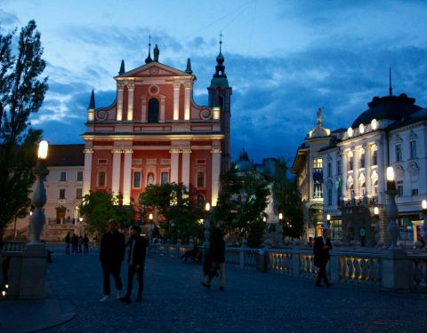 Prešernov trg广场上粉红色的巴洛克建筑物是Franciscan教堂。这一景也算是卢布亚尔那的经典景色了。