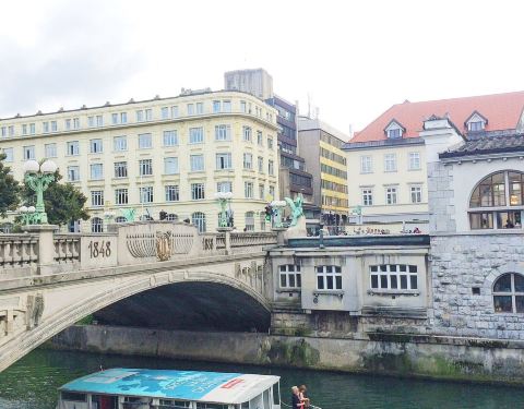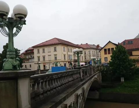 我们是下午抵达的,要住一晚,所以先参观了这里的老城堡,走了一段上坡,城堡就在老城的山坡上,可能当时带有军事防御和哨所功能,地势险峻,构筑独特。由于这座城市受过多个种族的统治,卢布尔雅那的城市建筑呈多元化的风格、尤其是奥地利和意大利的痕迹较多,文艺复兴风格、巴洛克风格、新古典风格等。我们登上位于市中心城堡上的最高处,极目远眺,整个卢布尔雅那尽收眼底,一大片高低起伏、错落有致的红屋顶,绿园顶和尖顶大教堂点缀其中,山上有绿色的植被与街道的绿树遥相呼应,蜿蜒的卢布尔河像一条玉带流过市中心,几座不同风格的桥静卧其上,城市山水相依,风光无限。 晚餐是一家不错的中餐厅,老板是广州人,说整个城市没几家中餐厅,这是最大的一家,服务优质,味道挺好,吃饱喝足。按照导游的吩咐继续游览,我们顺着市中心的卢布尔雅那河走,这是一条城市母亲河,中间有若干座桥,主要的人文历史也都是围绕着这条河。好像欧洲的城市都这样,都是依河而建,因河而兴。导游叫我们走到一座叫三桥的地方做一些停留,就可以折返,三桥是三河汇聚的地方,也是城市中心。