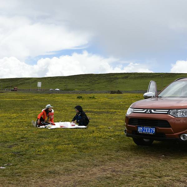快到垭口的时候,两位放羊的牧人,坐在路边喝茶,邀请我休息一下,喝点茶。