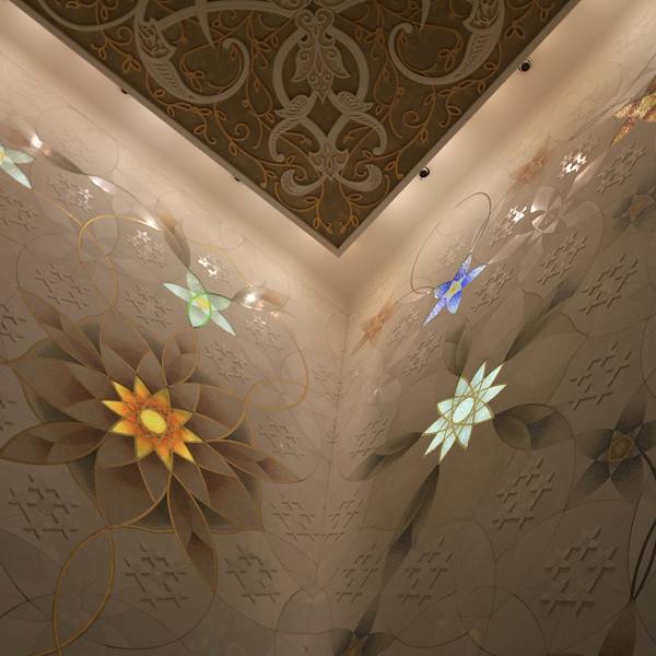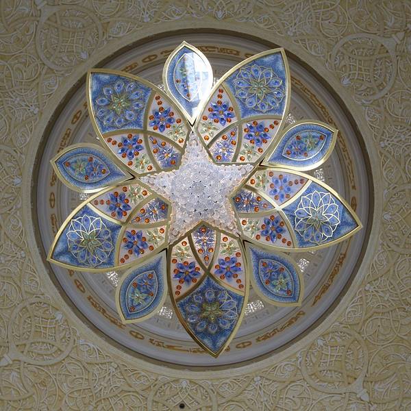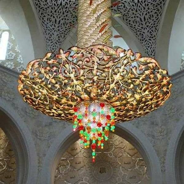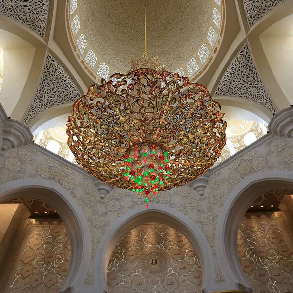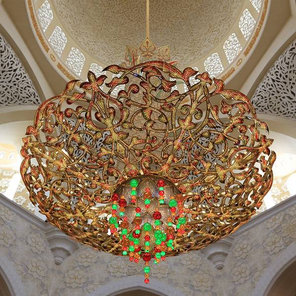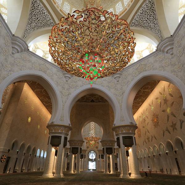 谢赫扎耶德大清真寺以华丽著称,黄金和汉白玉砖墙不计其数,水晶吊灯数万盏,据说建设总花费约55亿美元。寺中的巨型地毯和水晶镀金吊灯更是精美。 镀金天堂 如果说白色使得这座寺院有着堪比天堂的纯净与肃穆,金色则赋予其灵动与妖娆的气质。廊柱的柱头上,点缀着镀金的椰枣树叶造型的装饰,它们像蔓藤一样向上延伸,充满生命力。墙面上镀了一层金,显得异常神圣。讲道台周身的花朵贝壳图案也因白金的点缀显得更加清丽脱俗。 价值千万的纯手工巨型地毯 这块地毯被誉为全世界较大的地毯,大小近6000平方米,由近1200名伊朗工人耗时12个月手工织成,用的都是来自伊朗和新西兰的羊绒,光设计就花了8个月。而令人惊叹的是地毯上没有一处缝痕。踩在上面软软的,无声无息,主殿弥漫着一种恬静祥和的气氛,可让人心里顿感安宁。 天价施华洛世奇水晶灯 这里拥有世界上较大的镀金水晶吊灯,该吊灯位于礼拜大厅的主圆顶上,表面全部镀金,并缀满了施华洛世奇水晶,是世界较大的枝形水晶吊灯。相同造型的吊灯,全寺还有6座,它们都镶满来自施华洛世奇水晶,数目达数千颗,流光溢彩。