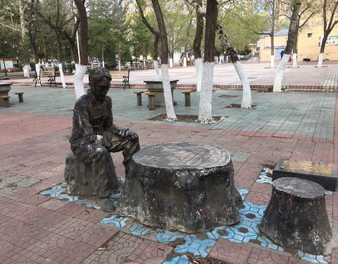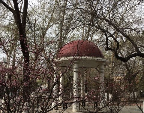 在二道街,平安医院对面,立交桥附近,在树少的草原腹地的边境小城,这里绿树较多,随着天气转暖,活动的老人逐渐多了起来,或打门球、跳广场舞,或围坐在石桌凳旁打扑克、打麻将,悠闲漫步愉快惬意