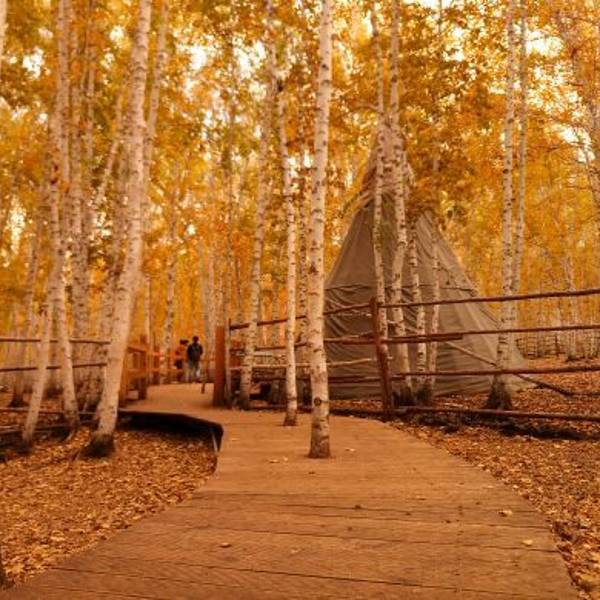一年四季均有不同体验:夏天绿意盎然,秋天一片金黄,冬春则像是兴安岭的白衣卫士静静驻立在这里。