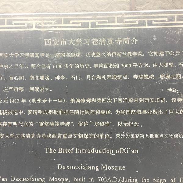 大学习巷清真寺是西安最古老的清真寺,位于大学习巷里,距离都城隍庙、回民街都很近可以放在一条线上游览大学习巷清真寺是西安最古老的清真寺,位于大学习巷里,距离都城隍庙、回民街都很近可以放在一条线上游览。清真寺是汉族传统建筑与阿拉伯风情的有机结合,步入其中,一种沧桑、古朴、陈旧的感觉扑面而来,甚是令...大学习巷清真寺是西安最古老的清真寺,位于大学习巷里,距离都城隍庙、回民街都很近可以放在一条线上游览。清真寺是汉族传统建筑与阿拉伯风情的有机结合,步入其中,一种沧桑、古朴、陈旧的感觉扑面而来,甚是令人追忆。清真寺内有三个重大事件,首先它是唐朝尉迟恭奉命修建的、其次它见证了郑和下西洋,最后它的牌匾是由慈禧太后赐字。清真寺免费开放,但请参观的人遵守礼仪,不要违反规定。 展开