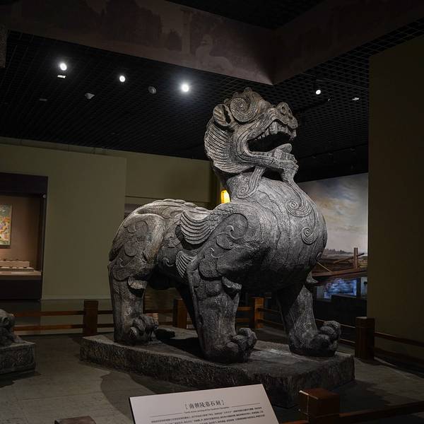 常州博物馆是了解常州的窗口,在博物馆里可以看到这个城市的文化和发展脉络。创建于1958年的常州博物馆,馆藏文物和自然标本达3万余件。有良渚文化玉器,春秋战国原始青瓷器,宋元漆器与瓷器,明清书画也是馆内最具特色的展品。在常州历史文化陈列展厅里有一场名为(龙腾中吴)的展,展示了常州史前到近代历史文化的基本陈列。以时间为主线的展览,分别展现了史前常州,延陵季子,齐梁故里,中吴要辅,儒风蔚然五大板块,将各个历史时期常州的重要遗迹,杰出人物,重大事件和珍贵文化遗产贯穿其中,展出文物一千余件,展现了常州悠久的历史和深厚的文化底蕴。南朝陵墓石刻,这是一尊石麒麟,造型雄伟,昂首挺立,繁缛而华丽,虽然仍存汉代遗风,但韵律已有变化,已经没有汉代大型石刻的朴拙,显得威武而富有灵气。麒麟也是帝王陵墓才可以设的石刻。时间匆忙,我们只参观了历史文化陈列展厅,但还有位于一楼的谢稚柳艺术馆,位于三楼的刘国钧捐献红木家具陈列,以及面向儿童的自然科普陈列,都值得一看。