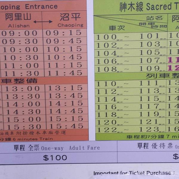 车站外的公示牌写的很清楚,票价、路程及注意事项都标示完整清晰。停靠在车站的阿里山小火车