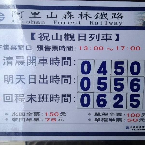 阿里山车站每天下午会预售第二天上祝山看日出的小火车票,因为每天就一班车上去,人数也有限制,所以我们直接把明天早上看日出的票也一起买了。日出时间每天都会有提示牌,欣欣民宿也有哦。来回票150NT