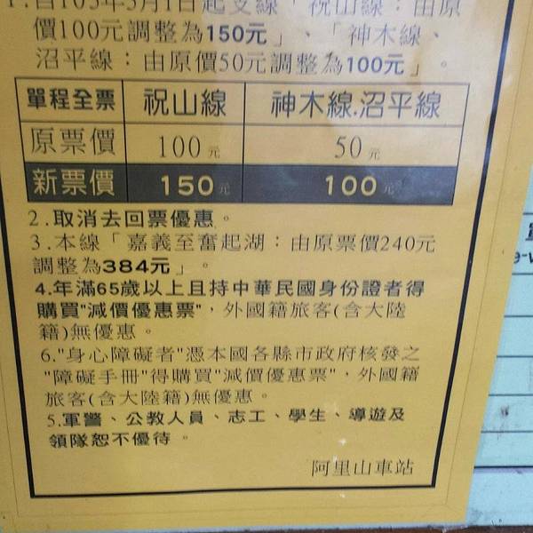 - 车站外的公示牌写的很清楚,票价、路程及注意事项都标示完整清晰。停靠在车站的阿里山小火车
