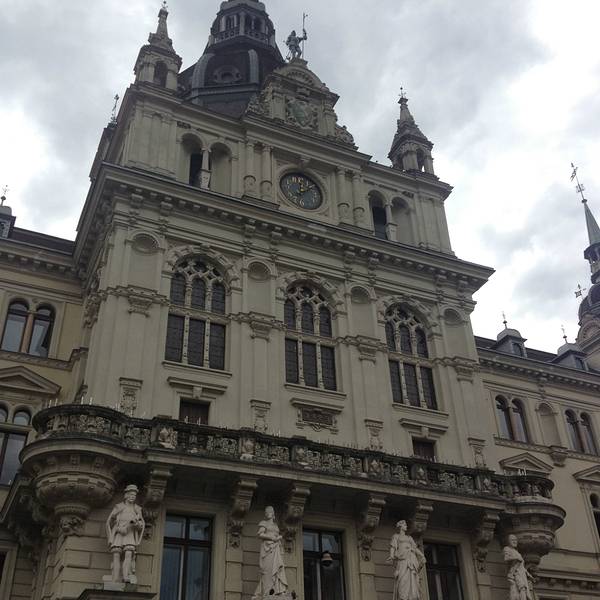 中世纪时期,老城区中心广场曾是一个重要的商贸集散地,后来成为格拉茨的城市中心。2002年广场进行了重建,从而成为公众聚会和游客集散的场所。夜幕降临,动人的乐曲伴随着柔和的灯光飘荡在广场各处,美丽的喷泉旁坐满一对对伴侣,浪漫温馨的气氛怎么能不令人陶醉。 步行至中心广场对面街角斯博街处(Sporgasse),是一幢橘红色的房子,叫做吕格屋(Luegghaus),屋子的整个墙面缀满了以灰泥制作出来的花纹浮雕,将巴洛克风格华丽繁复的雕花展现无遗。这栋建于16世纪的建筑,是格拉茨较古老的药局。