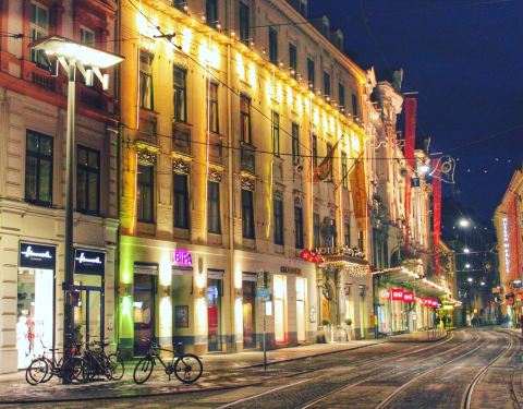 格拉茨的市中心,夜幕降临,气氛温馨浪漫。