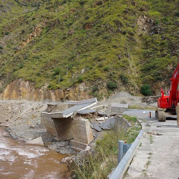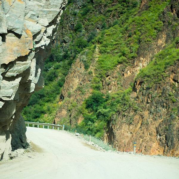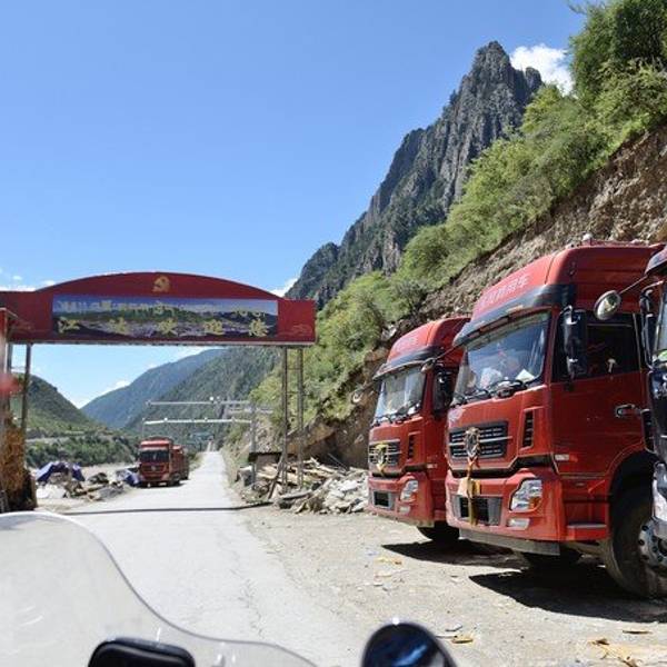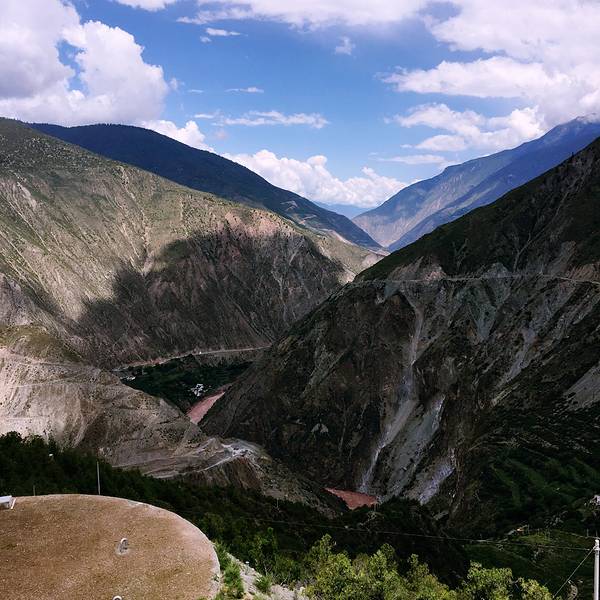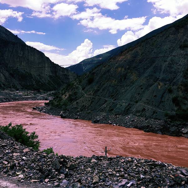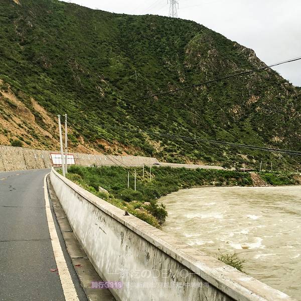 小石同学也撑了过来,而且有开车的游人送了罐红牛给他,不愧是小鲜肉,还是招人待见。积水遍地,尘土飞扬从海子山上下来之后,地形就从高原草地换成了高山峡谷。今天路远坡多,早早的我们就出发,沿着奔流的 金沙江 蜿蜒向上,开始进入 西藏 地区。金沙江 并不是金色的,而是铁锈一样的红色,比 黄河 的颜色还浓。川藏...从海子山上下来之后,地形就从高原草地换成了高山峡谷。今天路远坡多,早早的我们就出发,沿着奔流的 金沙江 蜿蜒向上,开始进入 西藏 地区。金沙江 并不是金色的,而是铁锈一样的红色,比 黄河 的颜色还浓。川藏交界处在 金沙江 大桥的中点。这里应该是个军事要地,上桥之前要严格检查,据说以前连拍照都不允许。小石的情报没错, 西藏 界后,一大段塌方路段在维修,只能绕道临时开出来的砂石路。积水遍地,尘土飞扬。避开了雨季,我们其实已经避过了很多麻烦,要不然可能不止这一处地方要维修了。这座桥不知道是什么时候垮塌的,洪水的威力可见一斑。只要是挨着江水的公路,路基塌陷就是常见问题。