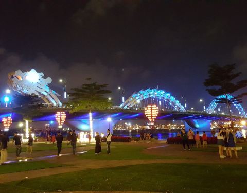 横跨在汉江上成双成对的龙桥和汉江桥,全长500多公尺的龙桥,龙身有500多盏LED灯,夜晚会变换各种颜色,每到周六和周日晚上九点,龙头会有喷水和喷火表演,持续15分钟。如果想要欣赏表演,记得提前步行至桥上龙头两旁的人行道卡位拍照,但也记得不要靠得太近,避免被喷水或火焰烫伤
