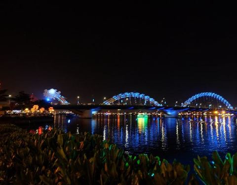 很美。第二次经过是白天,当时租了摩托车自驾,桥是主干道,车流很密,河景不错第一次是晚上经过,从机场出来,桥的灯光效果不错;第二次经过是白天,当时租了摩托车自驾,桥是主干道,车流很密,河景不错。很美。