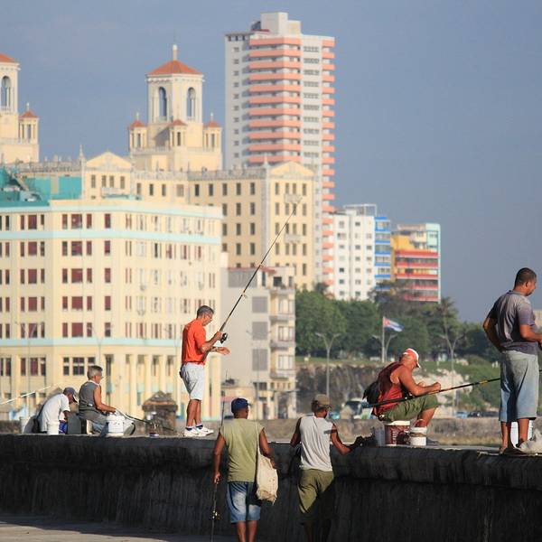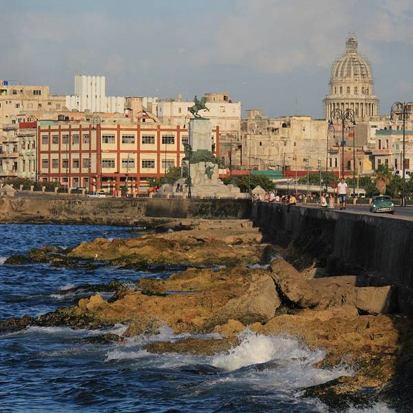 Malecón是一条神奇的海滨小道,你可以在这里做任何时期,随随便便就能打发一天的时间。早上你可以看朝霞,听涨潮的时候海浪拍击海岸的生意,有些调皮的浪花甚至会翻到马路中间,所以你会看到海岸边经常会有潮湿的一小块一小块洇湿。中午的时候,可以坐在石道边,看着哈瓦那的小孩子在岸边奇形怪状的石头上走来走去,或者是在水里扑腾。而到了傍晚,歇凉的当地人全出来了,不早点占个座这里会没有容身之处,看着晚霞和落日,吹着海风,路边美丽的建筑也星星点点的亮起来了,这就是哈瓦那人的一天,简单纯粹。