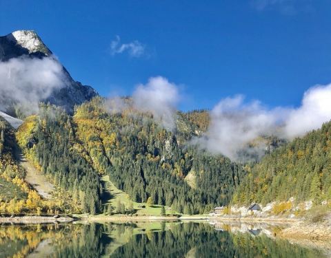 酒店附近有缆车站,可以上到旁边的Zwieselalm峰看整个戈绍湖。雾气可能不会很快消散,但乘坐缆车上山,很快就穿过了这层云雾,越往上天空越晴朗。缆车到达的地方海拔是1475米,右边是戈绍湖,左边则是戈绍小镇。戈绍湖上山的缆车基本每15分钟一趟,往返的家庭缆车票是30.5欧元。