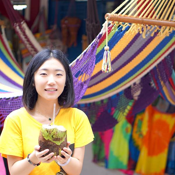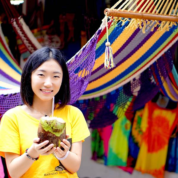 五颜六色的纪念品很美丽,我们买了椰子吃,喝完椰汁可以劈开来吃椰肉,为了挖椰肉还牺牲了我一根手指...