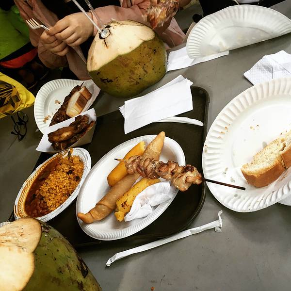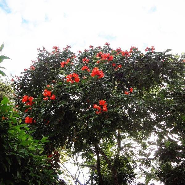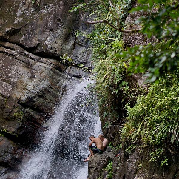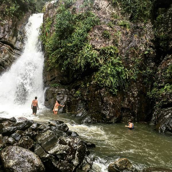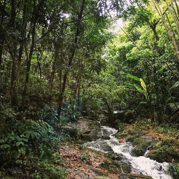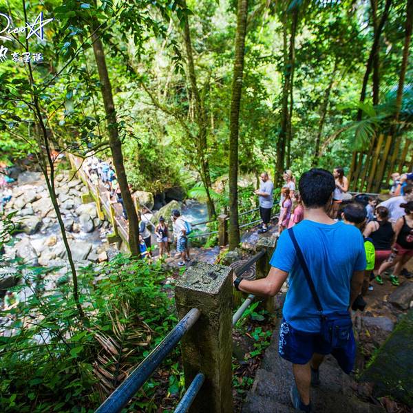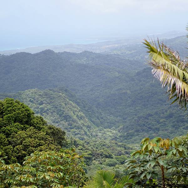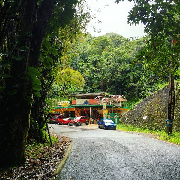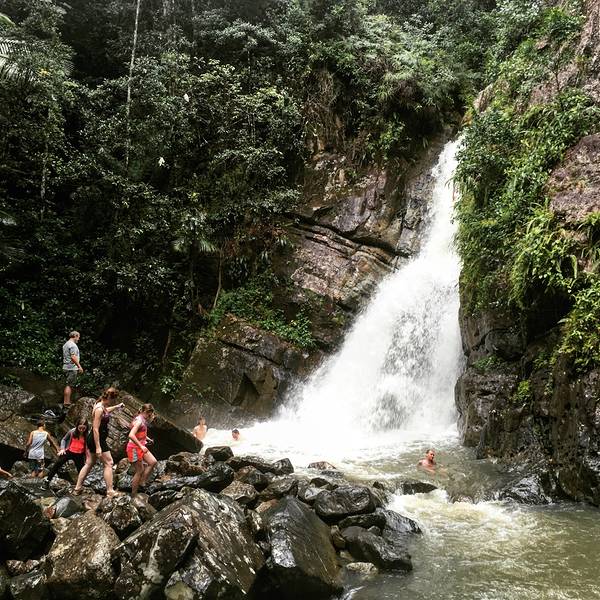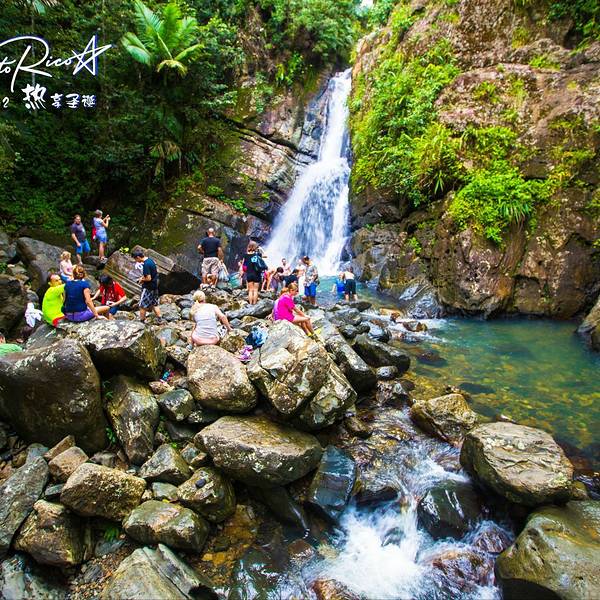 虽然,近期ZIKA病毒在波多黎各还是有存在,但因为云雀森林公园实在太出名,于是,我们还是决定自驾前往。一路上,雨林的标志从路标到墙画都非常显眼,游客中心从早上7:30到下午6点开放,每人5刀。但如果自驾,可以从南门或北门直接开车进入森林公园,不会经过购票点。自然公园空间阔大,免费停车场和街趴都很多,因而,感觉自驾游森林公园,也是省钱、方便的一种方法。公园的北门是主门,但近期道路休整,很多时间,北门都会被封掉。南门部分,进入后就是前往La Coca大瀑布的道路和指向。前往大瀑布只可步行,因而,南门虽然相较更美,但需要走的部分也更多。一般在南门口的小餐厅面前的路上可直接停车。如果一早出发的,建议停车后,可以在这里的当地小餐厅先吃点小食,椰子非常鲜甜清爽,黄米饭和墨西哥鹰嘴豆也是补充能力的好料,味道也很不错。接下来45-60分钟的徒步山路,还是很耗费经历的。要前往南门的话,务必留意街边的墙画或文字,个人很爱这里的树蛙标志,Tree Frog可算是波多黎各特有的热带生物象征。去雨林时有淅淅沥沥的小雨,空气清新,打开车窗,外面就是美丽的Le Coca瀑布。森林公园的海拔很高,云雾徐徐,细雨朦朦,路上随处都有高耸入云的韩剧常见的连理树。一路驱车,周围有很多非常棒小的瀑布,也正因此,这里的绿化要是再规范一下,便是分秒值得珍惜的景致。途径小瀑布后,再往前开了一下段,发现这里有很多很多绿植覆盖的庭院,但又是私宅,完全羡慕。这样开着红花的树,算是热带雨林的代表性的绿植,香气不重,但很有映山红的文艺气息。森林公园有一个免费的瞭望台,这里可以看到远处圣胡安老城区的层层山峦。阴雨朦朦的天气,周遭的湿气营造出一种淡淡的水墨画。在热带雨林徒步的时候,一定要穿方便的运动鞋或洞洞鞋,雨林的步道很是湿滑。穿短一些方便行走的裙裤,涂好防晒,雨伞在雨林倒不是必备,虽然,这里经常下雨,但大树遮蔽下,几乎淋不到雨水。雨林深处有一个大瀑布瀑布汇集的池子,这里有瀑布冲击的激流,也有平稳的流水。很多游客都直接带着泳衣,在这里漫游。还有一些人喜欢在石块上行走,间隔较宽的黑石,在其中穿梭时,有一种暮光之城,吸血鬼越走的错觉。最后给个建议,来雨林,带一瓶矿泉水,以及一块质地较好,可以遮阳,可以除水的大丝巾,真的很有必要。