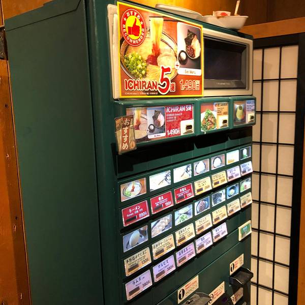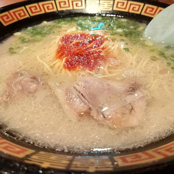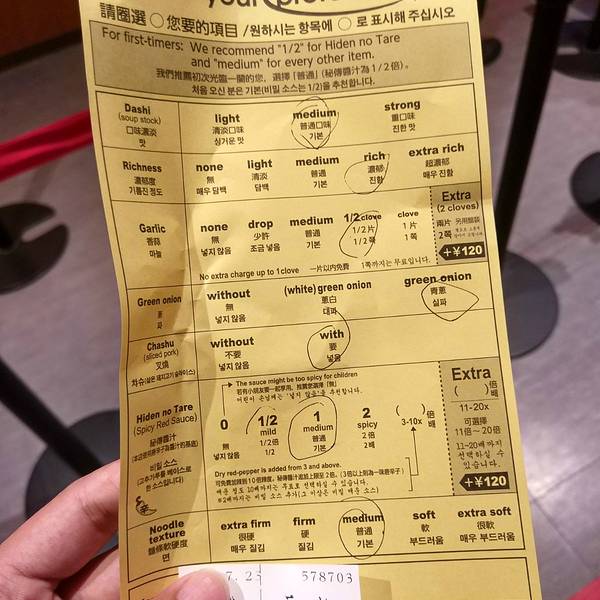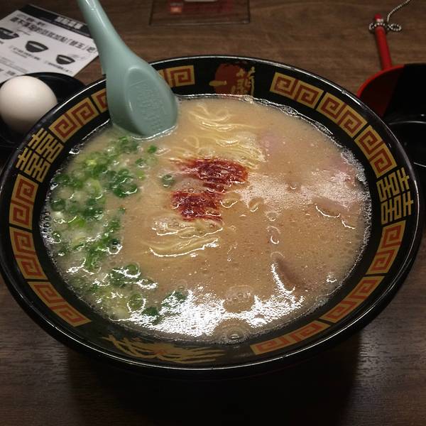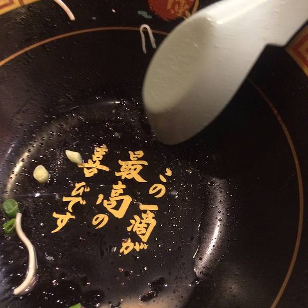 一兰拉面估计是国人心中日本拉面界的第一名,它只卖博多豚骨风味的招牌拉面。生意非常火爆,本店曾一天接待上千人。我们是去离本店距离几分钟脚程的分店吃的,毕竟本店排队的长龙太可怕了。进去会领到一张菜单,根据自己的口味灵活地选择面的硬度、辣度、汤的浓度、油度,各种配料等,很好地照顾到每个顾客的口味需求。用餐环境有两种选择,分别是一人座和多人座,其中一人座就是中间有挡板隔挡,照顾隐私,非常人性化;多人座就是普通的桌子。一人座排队时间短,多人座排队时间长。点面是用机器自助点单,付完款后将出的单子交给服务员即可。面汤的味道确实很浓郁,口味跟汤达人的豚骨拉面差不多!吃完后会发现碗底一行日语,推测意思是“您喝到一滴不剩,是我们最大的荣幸”。