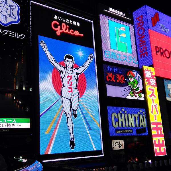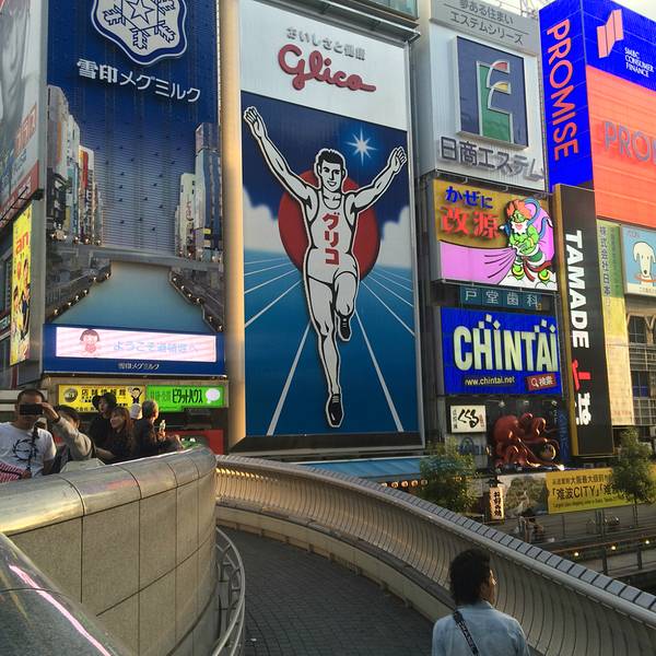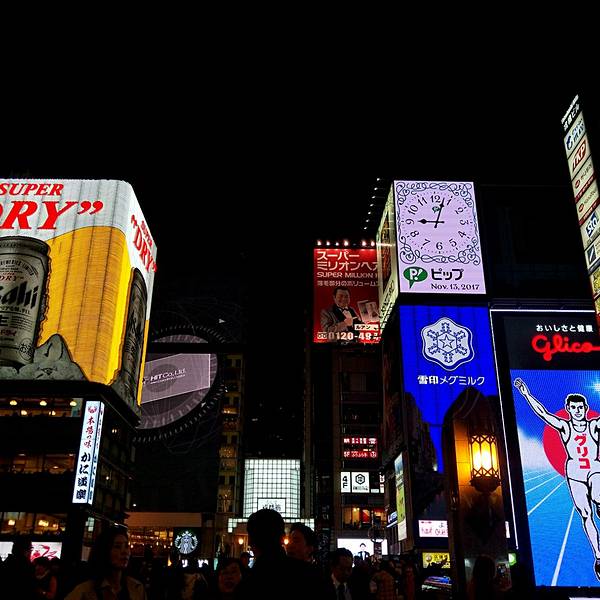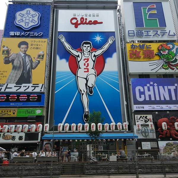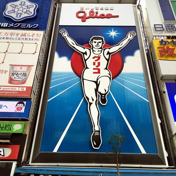 在道顿堀戎桥上可以看到两块有近百年历史的“雪印”和“格力高跑步者”招牌,是心斋桥的一大标志