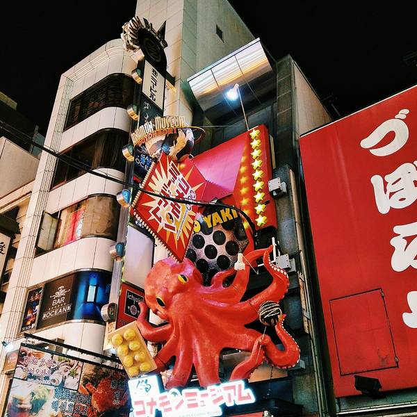 川流不息的人潮里是各种霓虹灯掩映的美食的招牌。这里很有特色:几乎是每一家店铺都把自己店里的东西都以巨大的浮雕形式展现在了店铺的上方,在夜晚的霓虹灯掩映之下,别有一番风情。而其中最有名的大螃蟹招牌更是道顿崛美食街的标志。这里之所以被称之为美食聚集地,是因为这里可以吃到很多其他地方根本没有的美味,比如说:金龙拉面、 章鱼烧、 回转寿司、 河豚肉等。不过花销自然也不可小觑,一个小小的摊位,就能花上几百块钱的人民币呢!全日本的美食都在这里争奇斗艳,不论你想吃什么,是什么口味的偏好,总有一个店铺可以满足你的嘴巴和胃。除了美食,道顿崛美食街旁边的千日前商店街可以供你买买买!会有中国店员在门口说“你好”!我惊奇地问她:你怎么知道我是中国人呢?她俏皮地说:“我只是冲街上喊,谁听得懂来理我,谁就是中国人呀!”