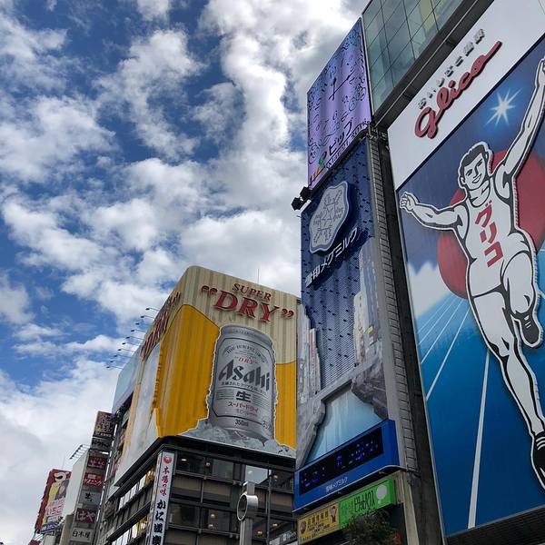 还吃了其他的一些食物后我们去到了道顿崛水上观光。大概每20 分钟一班,白天坐不用排队,晚上的话可能等的时间会比较久,看到的风景不一样,有大阪周游卷的话可以免费乘坐,买票的话需要900日元。坐船时,一会下雨,一会不下雨,真是不一样的感觉,还是蛮好玩的。天气晴朗,拍到了这样的照片还是很开心的,蓝天白云,看着让人心情舒畅。下船之后,在道顿崛附近逛了逛,来到了众人打卡地,有了这张照片,是不是才能证明自己来过大阪呢。