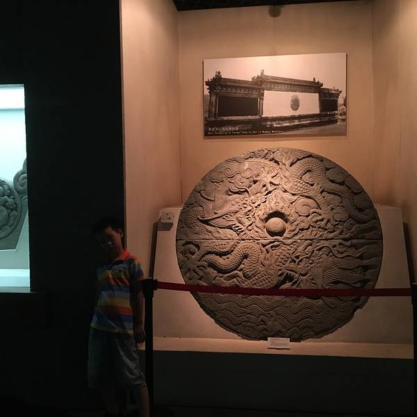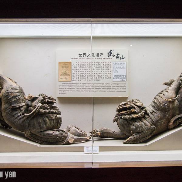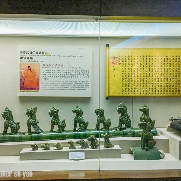 武当博物馆的整个场馆是一个椭圆形的两层楼建筑,外表看起来是非常简洁而大气的,博物馆的中间一个太极广场,对面正对着的是太极剧场。我们是2点40到达的,结果门是关着的,我们以为是闭关,就在附近的商店买水顺便打听了一下,店老板告诉我们应该会开门的,于是我们在前面等了一会儿,大约快3点的时候开馆了。所以除了星期一以外,如果去了看到关门了,就跟博物馆前后门的保安打听一下当天是否会开门!除了需要携带身份证意外,饮用水都是不可以携带进去的,需要寄存在门口的哦,这个跟很多博物馆一样。就没什么好纠结了的!拿身份证在大门入口右手兑换了门票之后,安检之后就可以开始参观了,如果跟我们一样需要保留门票的话,就提前跟工作人员说,不然门票在检票之后是不退回的哦。一楼的两个展厅主要是讲武当山的建筑,照片和展馆都非常详尽的在展示武当山建筑的美。特别是木雕的部分是最让我觉得叹为观止的,非常的精细和完整,建成这么多年,居然还能保存的完好如初,精细无比,各种神兽的细节雕琢的最让人叹服,胡须鳞片都是栩栩如生。即便是现在有这么卓越的电脑技术之后,也不一定能做到这么传神,防腐技术这么完美吧!这些可是武当山建筑上面的屋脊上的一些神兽,有没有觉得憨态可掬呢!真的很难想象这是六百年前的古人们烧制出来的琉璃制品!太精美了!