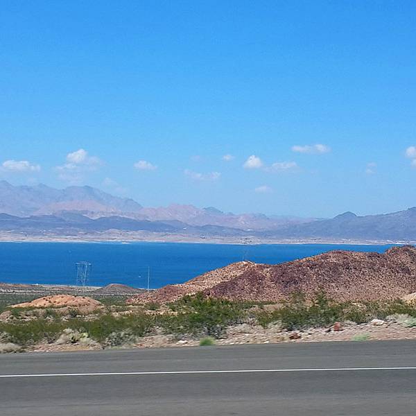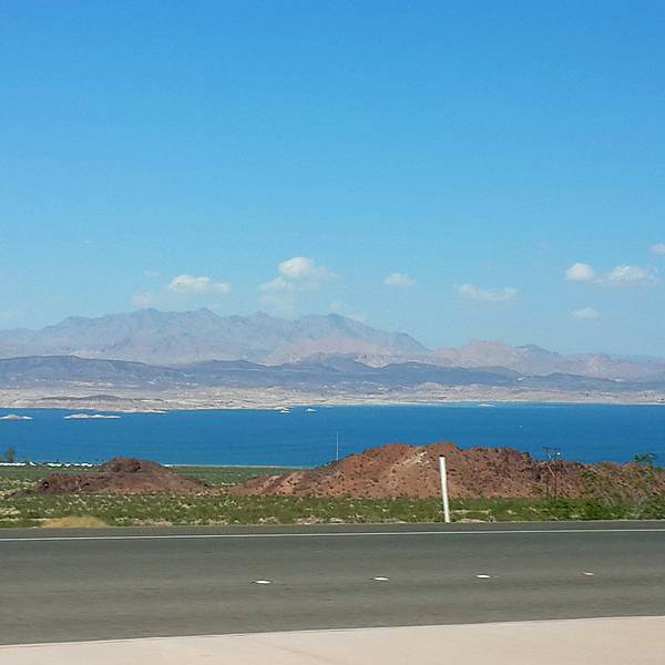 通往米德湖的道路很畅通,行驶条件良好,坐在车里,望着窗外的蓝天白云,心情特别舒畅。尤其是快要到达的时候,公路正好是沿着由高往下的坡度行驶,远远看到一片蓝色湖水突然出现在视觉里,那份喜悦是不言而喻的。我们到达拉斯维加斯正好是中午,安排好住宿,吃了午餐就出发,一直玩到日落西山返回。