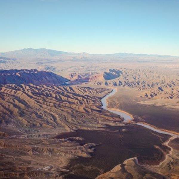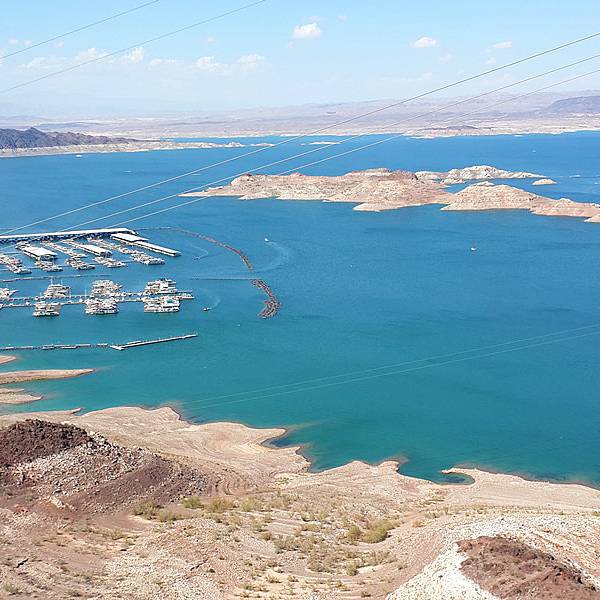 湖畔造了很多高端的连锁酒店和度假村。这拉斯维加斯但凡是个酒店都有游泳池,完全感觉不到在大沙漠里淡水的珍贵,财大气粗啊。米德湖,那些小白点是游船中心停泊...科罗拉多大河因为胡佛大坝的拦截,而汇成米德湖。