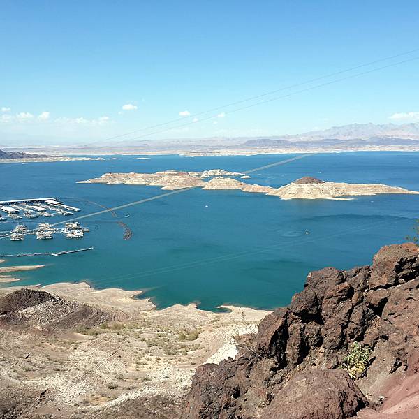 米德湖的形成是有由科罗拉多河上的胡佛水坝拦蓄而成的,蓄水量之大被称为世界上最大人工湖之一,湖水湛蓝,视野开阔,想想在沙漠之地能看到这么一片湖区也是很令人欣喜的。见到湖水后到达观光平台还需沿着弯弯山道行驶一段路,观光台设在一个至高点,那里有关于米德湖的图文介绍,以及供有停车点,厕所等设施,不用买门票。