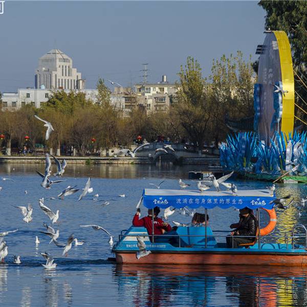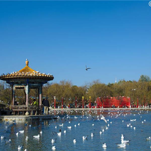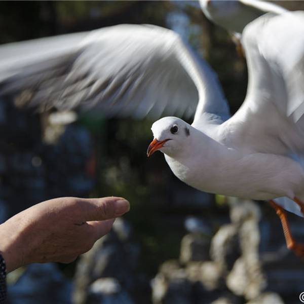 冬天里大观公园有许多从西伯利亚飞过来越冬的海鸥,目测有几千只,飞来飞去非常壮观。白天的游客不是很多,可以在公园里买一袋海鸥喜欢吃的面包来喂海鸥,只要把手伸出来,海鸥自动就会飞过来。这些海鸥大多数都被游客喂得肥肥胖胖的。