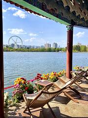 2. 必拍角度:长廊倚栏拍湖景+摩天轮、逆光拍剪影、花海与古建同框