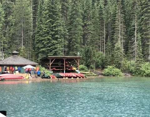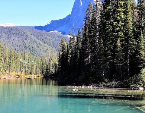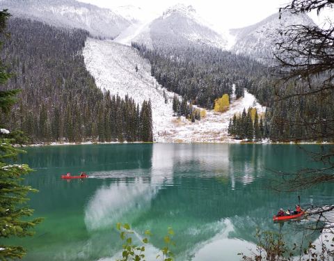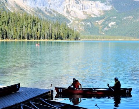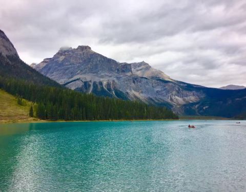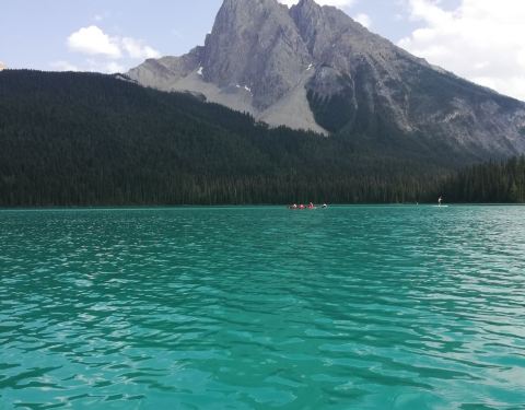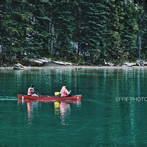 但是经历了冰原大道的10小时驾驶后...在去之前看了很多攻略,对翡翠湖一直有深深的向往,一是因为翡翠湖是很特别的碧绿色,二是因为翡翠湖相对于班夫的明星湖们来说,人会少一点,租船的价格也便宜些,70块一小时。