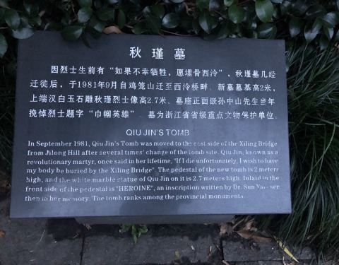 游完孤山过西冷桥前会看到一个很醒目的白玉石像,旁边有大理石碑介绍她。秋瑾的石像英姿飒飒,气宇不凡,令人怀念这位民族英雌。