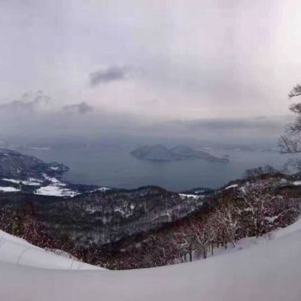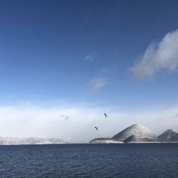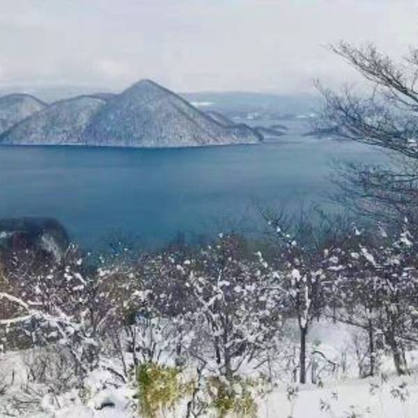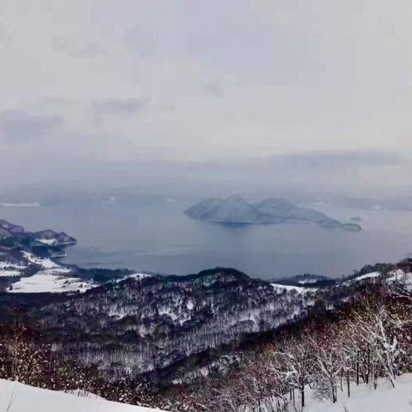 洞爷湖很少能看到积雪这里该下雪的时候下雪,该晴天的时候晴天,近处的湛蓝,远处的黛色、雪白在蓝天...