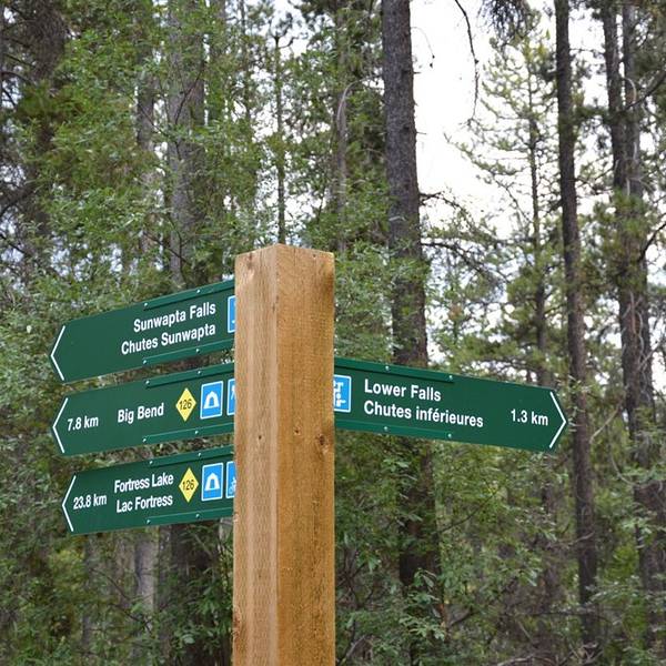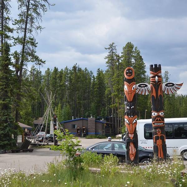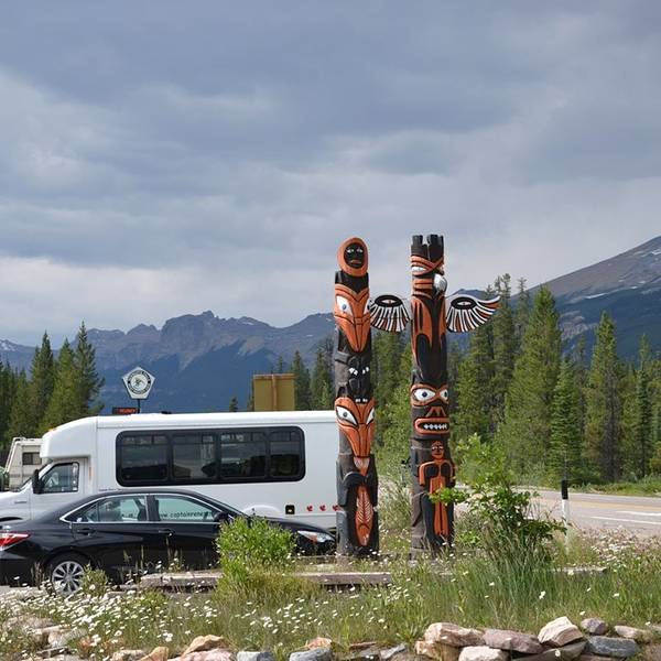 返回游客中心开车继续前进。对了,前面忘说了,从距离路易斯湖的南端起点122公里的Sunwapta Pass开始(好像分界处有停车点和标记的,我们没注意),就已经离开了班夫国家公园,进入贾斯珀国家公园。而哥伦比亚冰原游客中心,距离南端起点有127公里,所以已经属于贾斯珀国家公园范围。 我们前往的下一处景点是森瓦普塔瀑布Sunwapta Falls,瀑布不在公路边,地图上标的是Sunwapta Falls Junction,这里距离哥伦比亚冰原和贾斯珀镇刚好各有50公里左右。下图就是Junction处的标志,一个小的停车场和两支图腾柱。