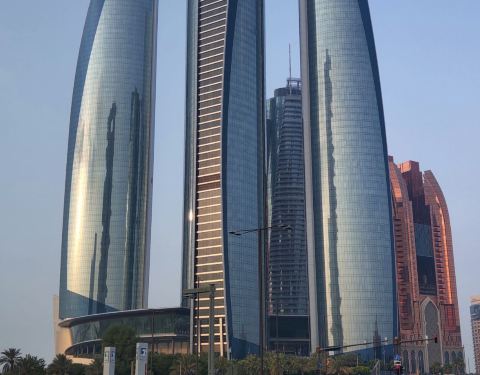 先重温下电影里精彩的飞跃镜头—。黄昏时间的阿布扎比海滨大道和阿提哈德大厦很美先重温下电影里精彩的飞跃镜头—而这一幕取景地就是阿布扎比Etihad Towers朱美拉联合大厦酒店就在这里我们从法拉利主题乐园出来大概开了40分钟车程就到了酒店附近。黄昏时间的阿布扎比海滨大道和阿提哈德大厦很美