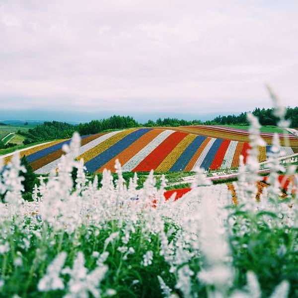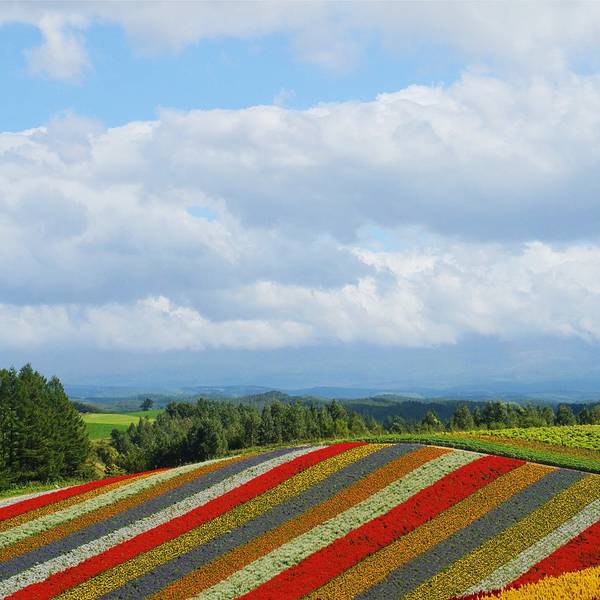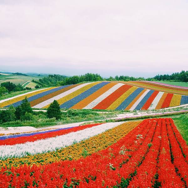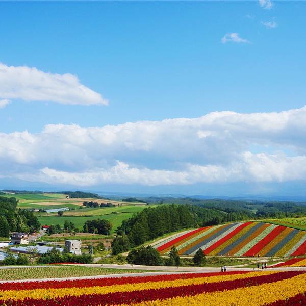 美瑛多丘陵,其起伏柔和轻缓,极具女性曲线之美,且一重重如波浪般向远处推开。通往美瑛的路上,沿线植满了色彩鲜艳的花田,春天是罂粟、夏天薰衣草、秋季有波斯菊和向日葵等各式各样争奇斗艳的花海,仿佛天使打翻了上帝的颜料罐,所有鲜丽的色彩一股脑都倾泻到美瑛的山坡,美不胜收。美瑛不光美景如画,出产也颇为丰富。除了经济价值颇高的薰衣草以外,这里还盛产小麦和蔬菜,如马铃薯、洋葱、甜菜,从盛夏到深秋,它们的果实与花朵,是美瑛画布中最壮观的大手笔。