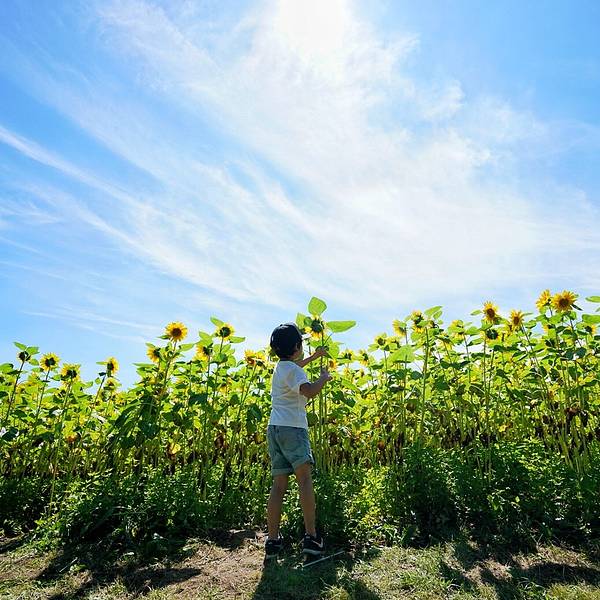 浑身都是宝当然,除了很好吃以外,它们还很好看。金灿灿的一片,走进花丛,仿佛周身都被温暖的阳光包围向日葵花田附近,还有一片非常小清新的青草地。坐在长椅上,是不是像极了日本文艺片中的女主角?玩累了,附近还有小店可以休息下。别看小少爷这时候坐得如此乖巧,像个文艺小少年其实他平时是这样的!!!奔跑!跳跃!不停歇!