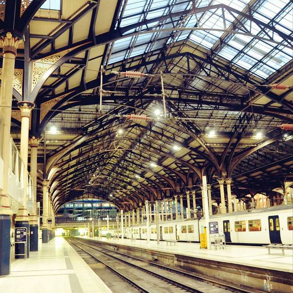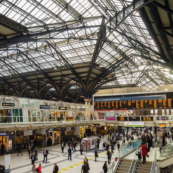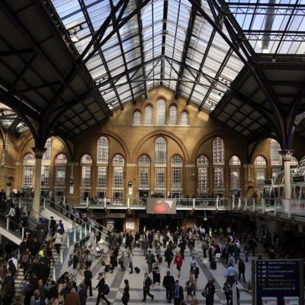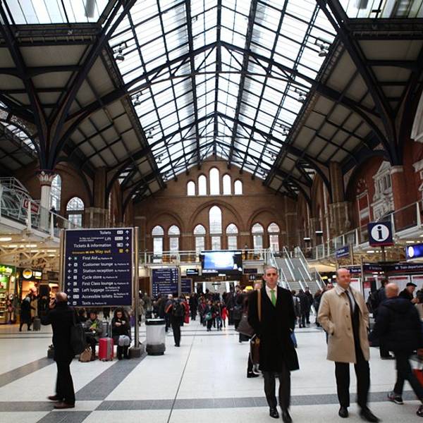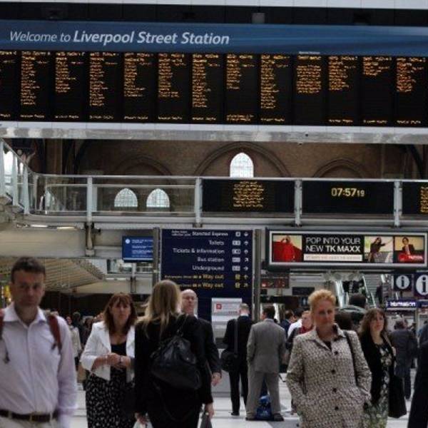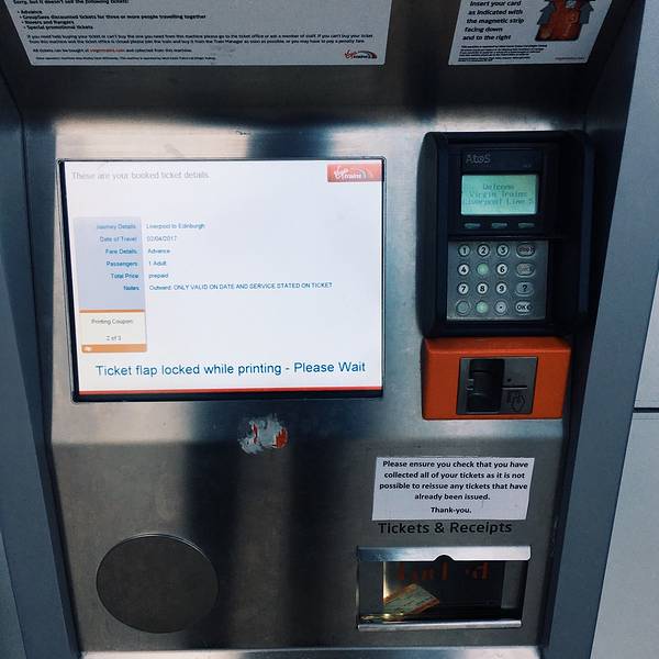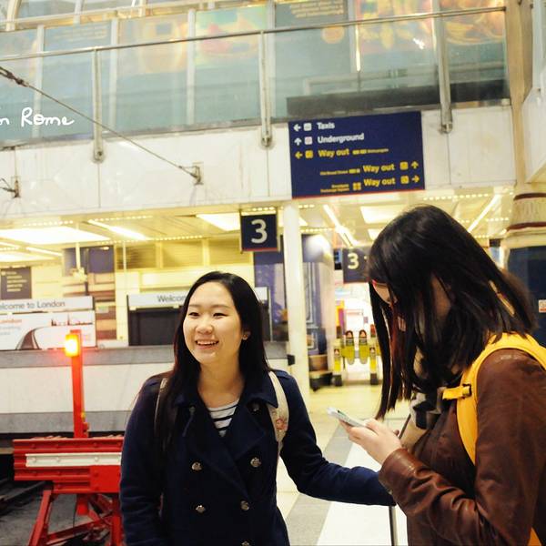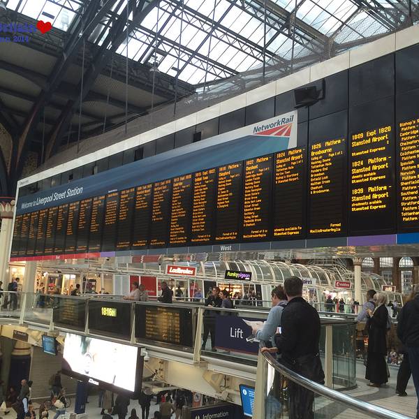 从特拉法尔加广场不远处的地铁口进入先返回酒店取行李,然后再次从酒店出发乘坐地铁直达利物浦站(酒店出发Central红线开往Eastbound方向乘地铁到Liverpool Street,出站后步行335英尺 到达火车站Liverpool Street Station, 全程29分钟)。出站后坐滚梯从地下来到地上这里便是火车站的候车及售票大厅了,还是非常方便的。先去自助机取在国内预订的火车票,由于要取的票很多,又赶上是下班高峰时间,花费了相当长的时间,取完票后去I台说明要购买Two together railcard,领取了表格,直接走进售票大厅,找个地方填表,最后去排队,队伍很长,但大多数都是买火车票的,所以速度比较快,轮到自己后,递上表格和照片,付款,然后就是等待拿卡,工作人员动作算是麻利的,偷空看了看屏幕上的火车时刻表,知道自己要乘坐的车次还没有通知站台,才算是能喘口气,而后便是领卡,带领一行人乘车,顺利到达剑桥。