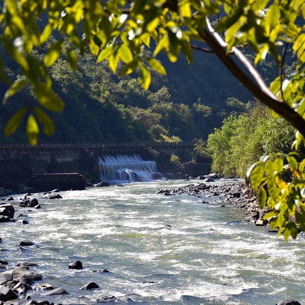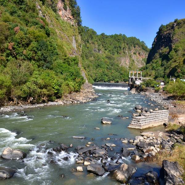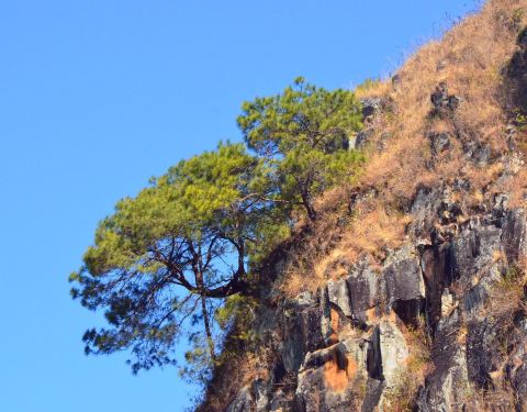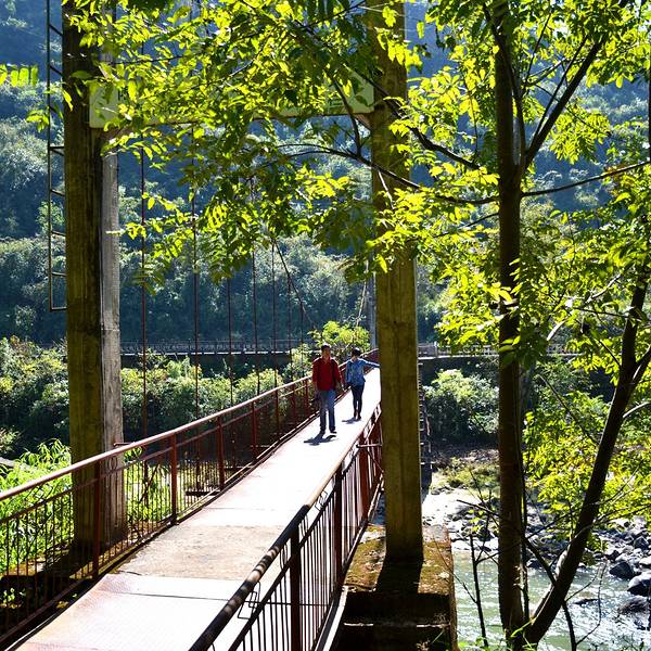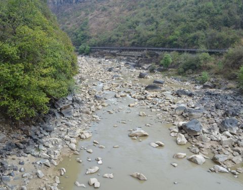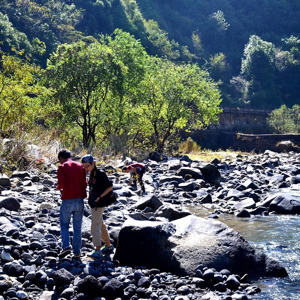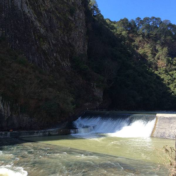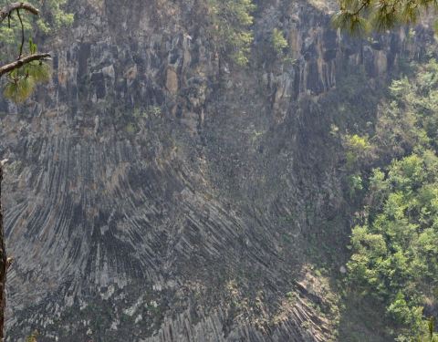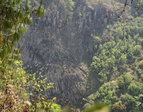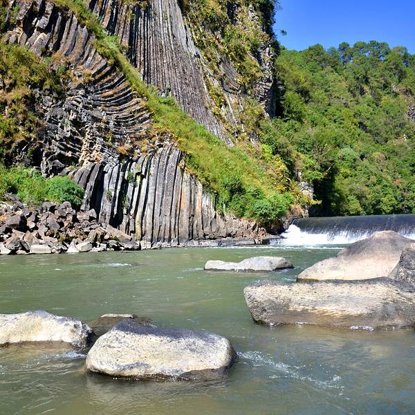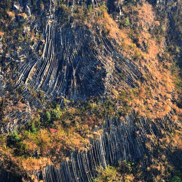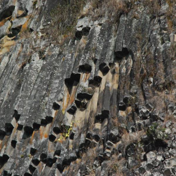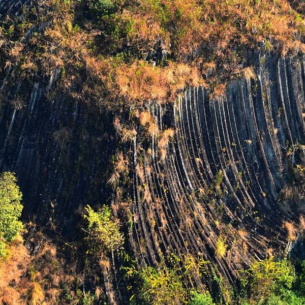 山谷中的河流就是龙川江,一座非常古老的吊桥横跨河的两岸。我们沿对岸一条几百米长的古老步道朔游而上,寻找奇特的柱状节理景观。此处正是观赏柱状节理距离最近的位置,“石柱”呈六边形,或凌空悬挂,倾泻而下。或直落江中,其排山倒海之势,蔚为壮观。我不禁再次感叹造物主的神奇! 展开