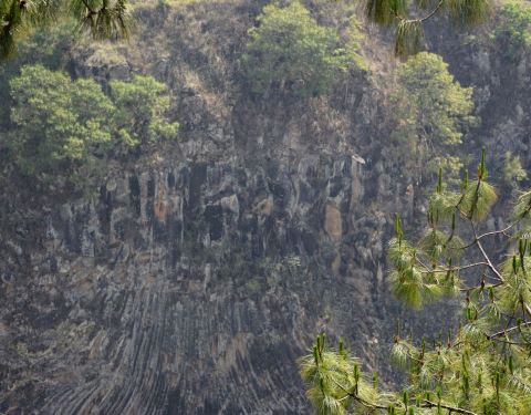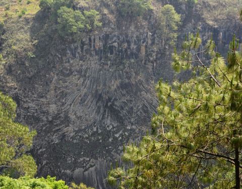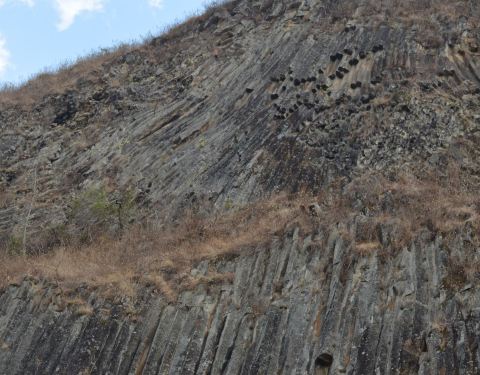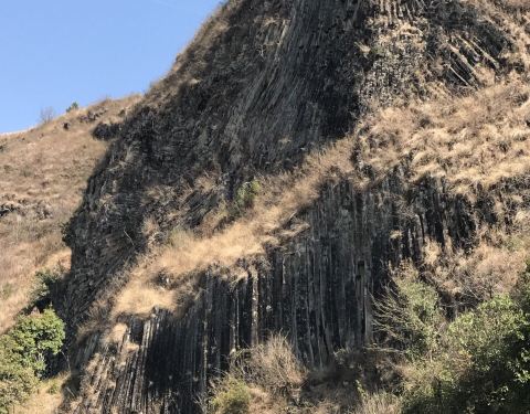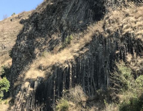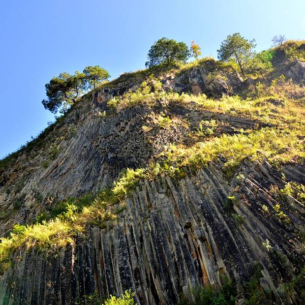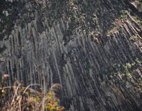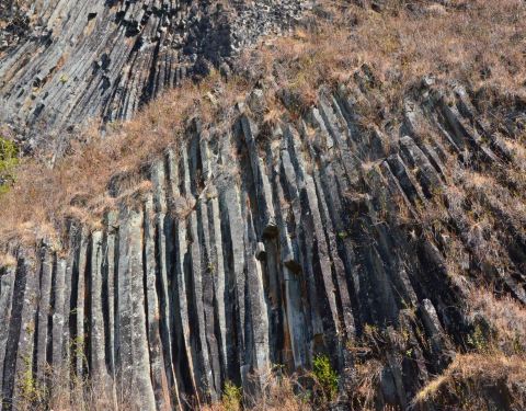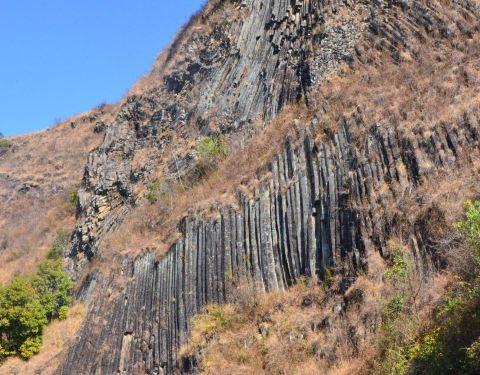 此处正是观赏柱状节理距离最近的位置,“石柱”呈六边形,或凌空悬挂,倾泻而下柱状节理是火山爆发时喷出的岩浆冷凝后形成的多边形柱状结晶,因为一根根垂直竖立像柱子一样,当地人形象地称为“神柱”。柱状节理可以站在山顶从景区外远望,也可进入景区近观。柱状节理景区与黑鱼河景区毗邻并...柱状节理是火山爆发时喷出的岩浆冷凝后形成的多边形柱状结晶,因为一根根垂直竖立像柱子一样,当地人形象地称为“神柱”。柱状节理可以站在山顶从景区外远望,也可进入景区近观。柱状节理景区与黑鱼河景区毗邻并相连,从山顶入口或山下入口都可以进入。我们就从山顶进入景区,司机则把车子开到山下黑鱼河入口等候。