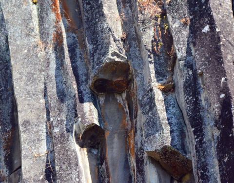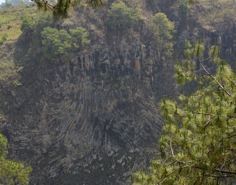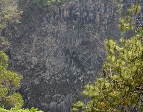 云南省腾冲县的龙川江畔,矗立着一大片火山爆发时喷出的未露于地表的岩浆冷凝后形成的柱状结晶,地质学上称为“柱状节理”,当地人则形象地叫它“神柱”。“神柱”是我国迄今为止发现的一片规模大、保存完整、年代短的柱状节理。火山岩浆喷发时的温度为1200℃,当岩浆冷却至800-900℃时岩浆结晶形成柱状节理。由于岩浆含有六方柱体的斜长石、橄榄石、角闪石、辉石等矿物质,所以冷却后形成六方柱体,称之为:柱状节理。素有“火山地质博物馆”之称的腾冲县共有70多座火山遗址,位于曲石乡的这片“柱状节理”,面积约2平方公里,形成于约4万年前。一根根数十米长的“石柱”,颇为壮观。这一火山地质奇观的完好存在,不仅为当地增添了一处独特的旅游景观,同时对于研究火山的岩浆生成和地质构造有重要科学价值。